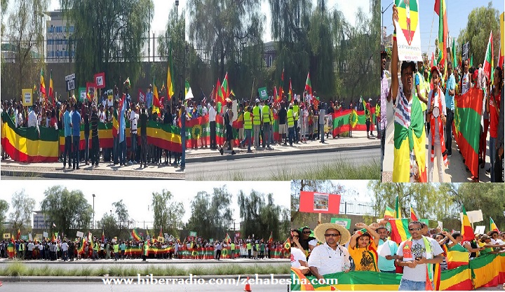 <<ፈይሳ ብሄራዊ ጀግና!፣ ወያኔ ሎገ አውት1፣ወያኔ በቃ፣አሜሪካ አሸባሪ የሆነውን የሕወሃት አገዛዝ አትደግፊ፣አሜሪካ ለአሸባሪው ሕወሓት የምታደርጊውን ድጋፍ አቁሚ፣ የኦሮሞ ደም የአማራ ደም ነው፣የአማራ ደም የኦሮሞ ነው! ወያኔ በአማራና በኦሮሞ ወገኖቻችን ላይ የጀመረውን የዘር ማጥፋት እንቃወማለን ! የኢትዮጵአ ሕዝብ በዘር ሳይከፋፈል በዘረኞች ላይ ይነሳልና ሌሎችም መፈክሮችን በማስደመጥ፣ በመዘመር ፣የታሰሩ የህሊና እስረኞች፣ጋዜጠኞች እንዲፈቱ በመጠየቅ ለሰዓታት የዘለቀ ታላቅ ተቃውሞ አድርገዋል።