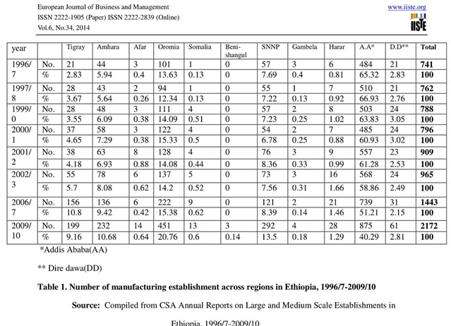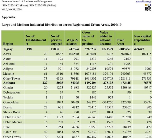 ከዚህ በታች የቀረበው ሰንጠረዥ ከኢትዮጵያ የማዕከላዊ ስታትስቲክስ ኤጀንሲ የተገኘ መረጃ ሲሆን። ይህ መረጃ እኤአ በ2014 በኤሮፓን ጆርናል ኦፍ ቢዝነስ ኤንድ ማኔጅመንት በሆነ ጆርናል ላይ ከታተመ የምርምር ፅሁፍ የተገኛ ነው። ይህ መረጃ በኢትዮጵያ መንግስት በይፋ የወጣና በአለም አቀፍ ተቋማትም የተረጋገጠ ነው። ይህ መረጃ ወያኔዎች በግልፅ ያመኑት ሲሆን ሌላ የሚደበቁትና የሚያጭበረብሩት ብዙ መረጃ እንዳለ ደግሞ ግምት ውስጥ መግባት ይገባዋል። ወያኔዎች ባመኑት መረጃ ይህን የሚያህል ለትግራይ አድሎና የትግራይ የበላይነት ካለ በተደበቁት መረጃዎች ውስጥ የእጥፍ እጥፍ አድሎና የበላይነት እንዳለ መገመት ቀላል አይደለም። መረጃው የሚያመለክተው ኢትዮጵያ ውስጥ እኤአ ከ1996 እስከ 2009 ድረስ በሰራ ሶስት ዓመታት ውስጥ ስለተመሰረቱት እንዱስትሪዎች የተመለከተ ነው። በዚህ መረጃ መሰረት በአገሪቱ ውስጥ በ2009 የተመዘገቡት ኢንደስትሪዎች 40 ፐርሰንቱ የሚገኙት በአዲስ አበባ፣ 9 ፐርሰንት በትግራይ ክልል፣ 10 ፐርሰንት በአማራ፣ 20 ፐርሰንት በኦሮሚያ፣ 13 ፐርሰንት በደቡብ፣ 0.6 ፐርሰንት በአፋር፣ 0.6 ፐርሰንት በሶማሌ፣ 0.1 ፐርሰንት በቤንሻንጎል፣ 0.1 ፐርሰንት በጋምቤላ፣ 1.2 ፐርሰንት በሐረር፣ 2 ፐርሰንት በድሬዳዋ ነው። ይህ መረጃ እንደሚያመለክተው የትግራይ ክልል ከአገሪቱ የሕዝብ መጠን 5 በመቶ በሚገመት የሚኖርበት ክልል የኢንዱስትሪ ባለቤት ድርሻው ግን 9 መቶ ይደርሳል ማለት ነው። ይህ ማለት የትግራይ ክልል መሆን ከሚገባው አንፃር በእጥፍ በሚጠጋ መቶ ፐርሰንት ሲበልጥ፤ በአንፃሩ ከአገሪቱ የሕዝብ መጠን ወደ 30 በመቶ በሚገመት የሚኖርበት የአማራ ክልል የኢንዱስትሪ ድርሻው 10 በመቶኛ ሲሆን ይህም መሆን ከሚገባው አንፃር በሁለት እጥፍ ማለትም በሁለት መቶ ፐርሰንት ያነሰ ነው።